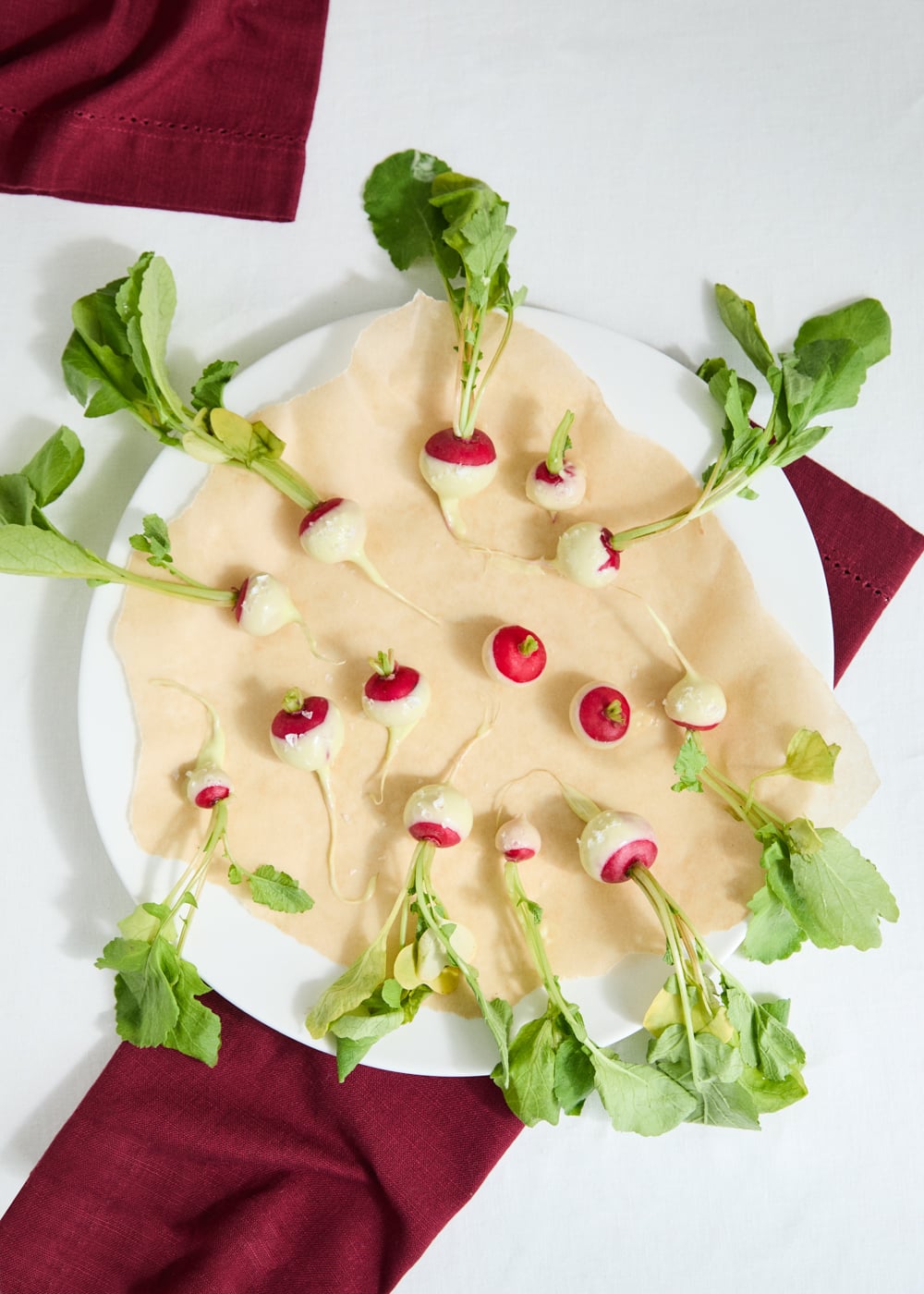 - Die Radieschen auf einer Platte anrichten und vorsichtig mit der Kräuterbutter überziehen.