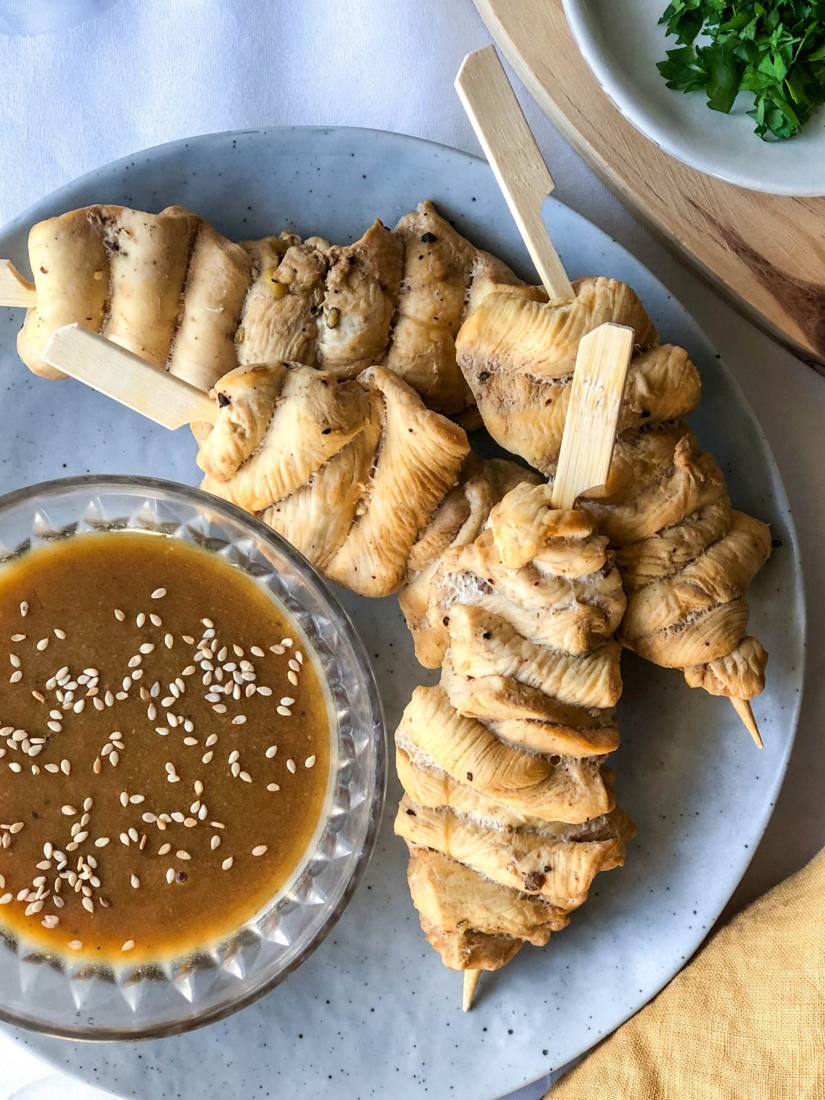 - Abrir la ChefBot y verter la salsa en un recipiente, acompañar con las brochetas y decorar con unas semillas de sésamo.
