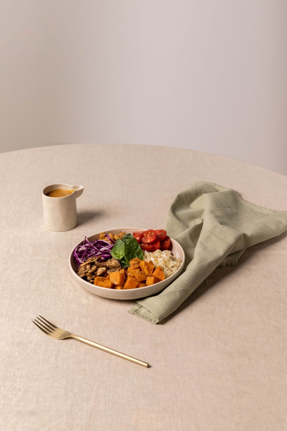 • Para preparar cada bowl, añadir arroz, boniato, col lombarda, garbanzos, champiñones, tomates cherry, espinacas, semillas de sésamo y salsa de soja y tahini.