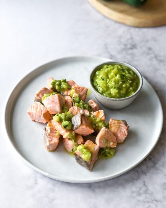 Dados de salmón al vapor con salsa de pepino Una receta saludable y muy sencilla de preparar. El toque fresco del pepino y del ...