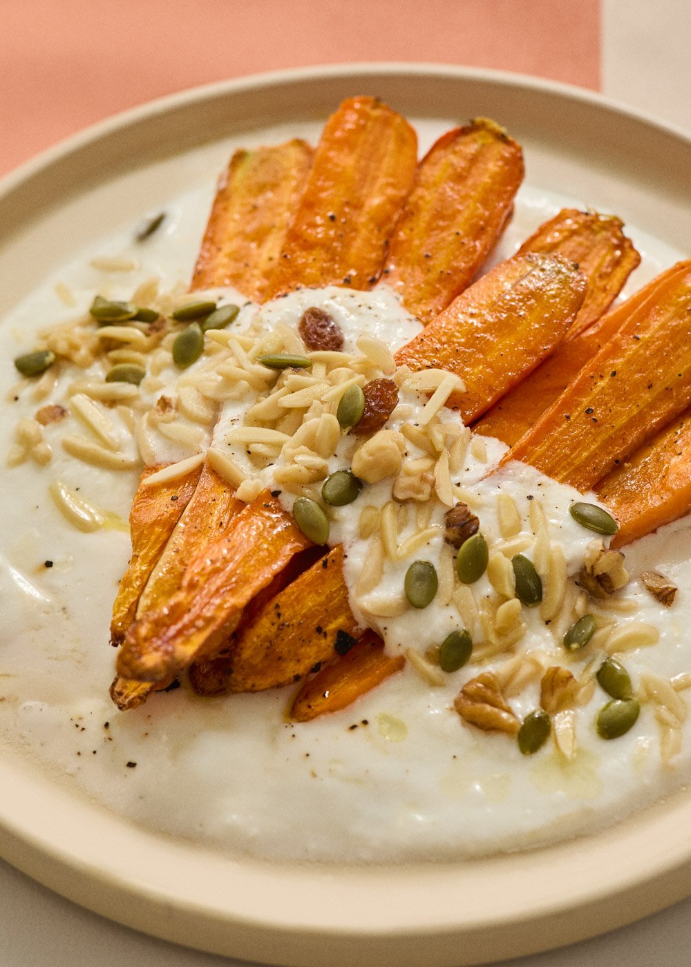 Zanahorias tiernas y caramelizadas que se acompañan de una salsa cremosa y un mix crujiente de frutos secos. Una ensalada cálida y llena de matices.