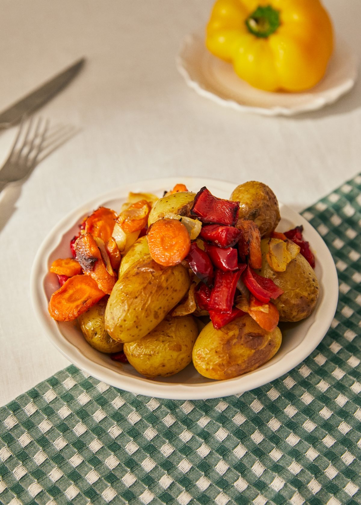 Preparar una guarnición simple y sencilla en tu freidora de aire es mucho más sencillo de lo que imaginas. Solo tienes que echar al cesto todas las verduras que te gustan, en este caso hemos usado patatas, pimientos y cebolla pero literlamente pueden usarse cualquier tipo de verduras.