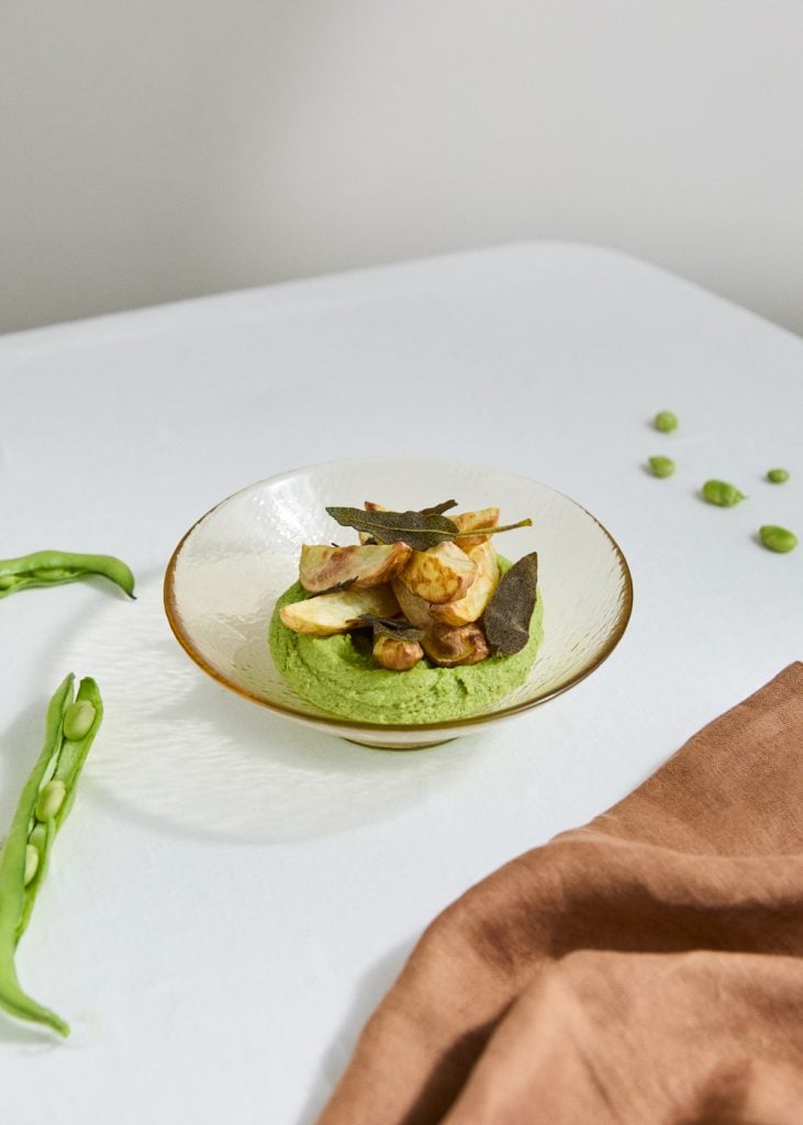 - Servez les pommes de terre tout juste cuites avec le pesto de petits pois et sauge.