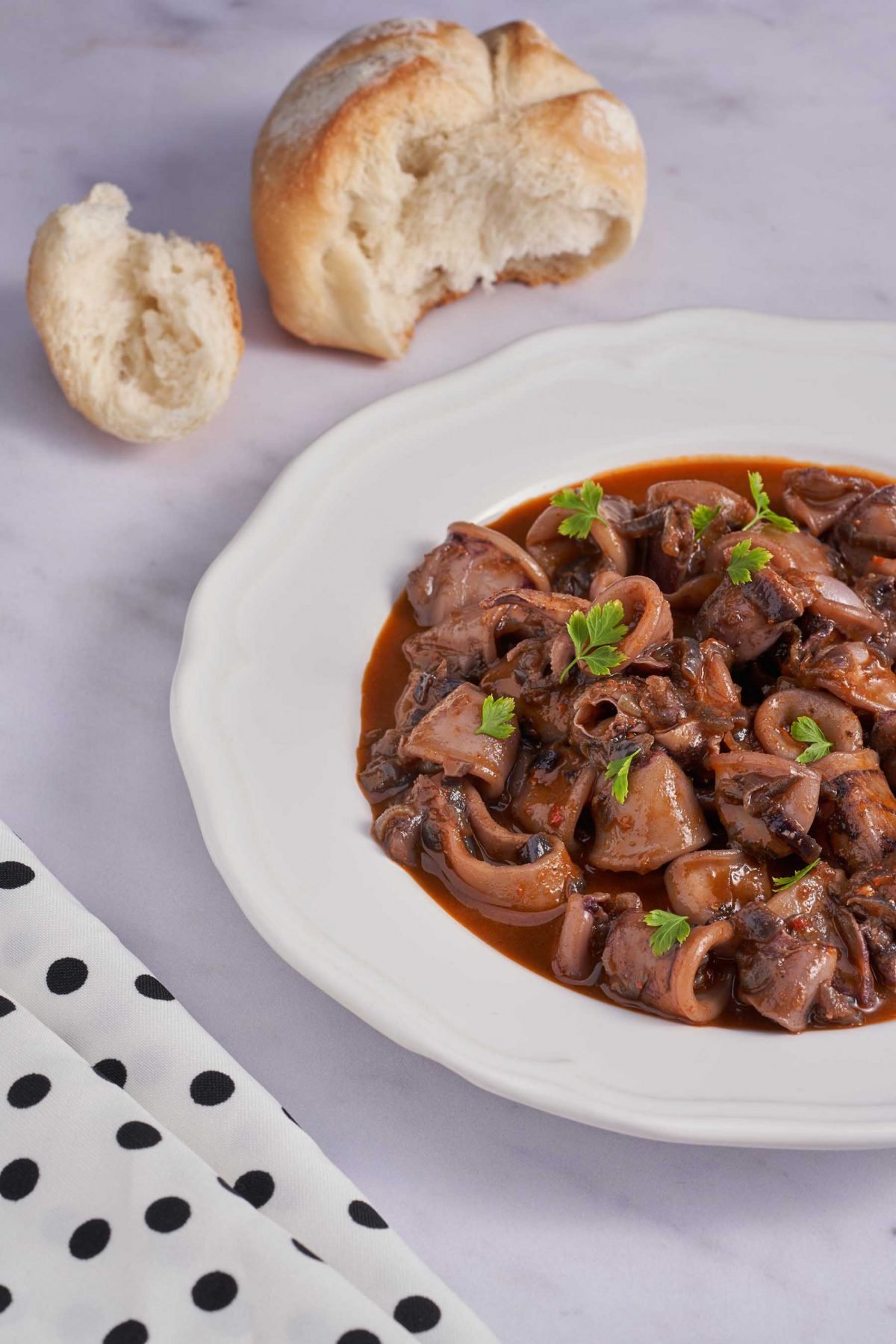 Un piatto semplice e salutare che possiamo servire con delle patate fritte tagliate a cubetti, con riso in bianco o con purè di patate: qualsiasi cosa che raccolga la salsa sarà perfetta. Accompagnati da un’insalata diventeranno un pasto completo, del quale ridurremo notevolmente il prezzo finale se sceglieremo di usare dei calamari congelati. Per far sì che la loro carne resti tenera, sarà meglio non superare i 10 minuti di cottura; se dovessimo esagerare e dovessero diventare duri, potremmo aggiungere ancora un po’ di vino e cucinarli a una temperatura media per un’ora.