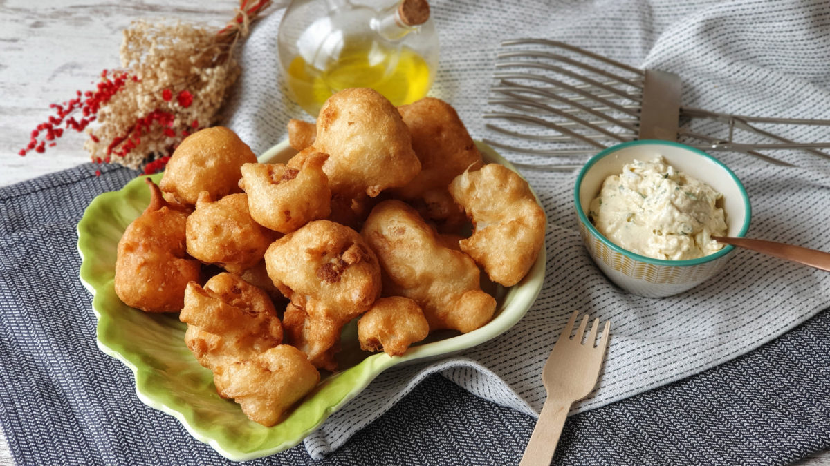 Una manera distinta de comer esta verdura, con no muy buena fama cuando se sobrecuece, pero que resulta muy rica y divertida cuando se transforma en un buñuelo y se unta en salsa gribiche: una emulsión francesa, similar a la mayonesa, que se prepara, además, con huevo duro y vinagre.