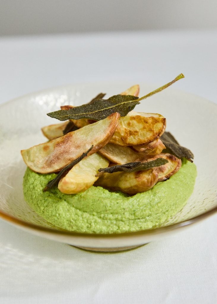 - Sirva as batatas acabadas de fazer com o pesto de ervilhas e sálvia.