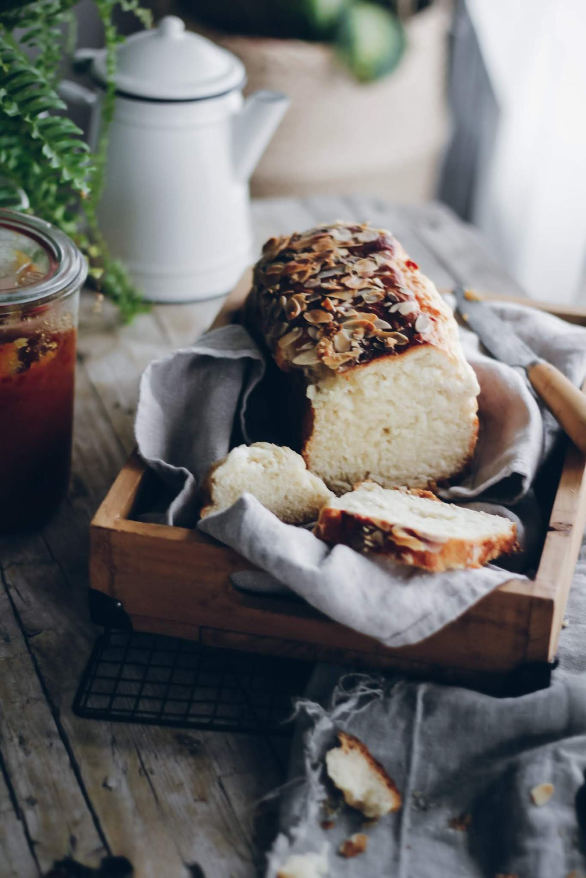 - Brush the brioche dough with the beaten egg and add the flaked almonds.