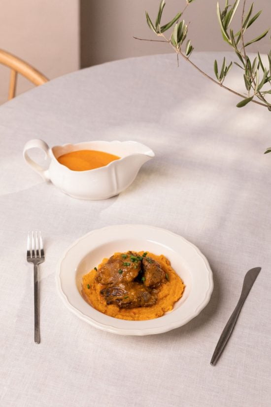 Braised pork cheeks with sweet potato cream This is the stew par excellence: a meat that melts in your mouth when you ...