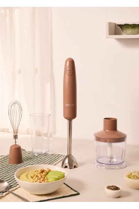 Stabmixer mit 1000 W Leistung und einem Gleichstrommotor, der stärker und langlebiger ist als herkömmliche Elektromotoren. Er verfügt über Klingen aus Edelstahl und Titan und 6 Geschwindigkeitsstufen, die bis zu 15000 U/min erreichen. Außerdem sind ein Messbecher, ein Becher zum Hacken und Zerkleinern sowie ein Schneebesenaufsatz im Lieferumfang enthalten.