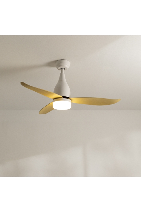 Ventilador de techo silencioso de diseño, con motor DC de 40W y función Reverse, que aumenta su eficiencia energética durante todo el año: refrescando en verano y distribuyendo el calor en invierno. Con aspas de madera chapada, 6 velocidades y mando a distancia. Tiene luz LED de 15W, seleccionable entre fría, neutra y cálida. Perfecto para estancias de 12m² a 20m².