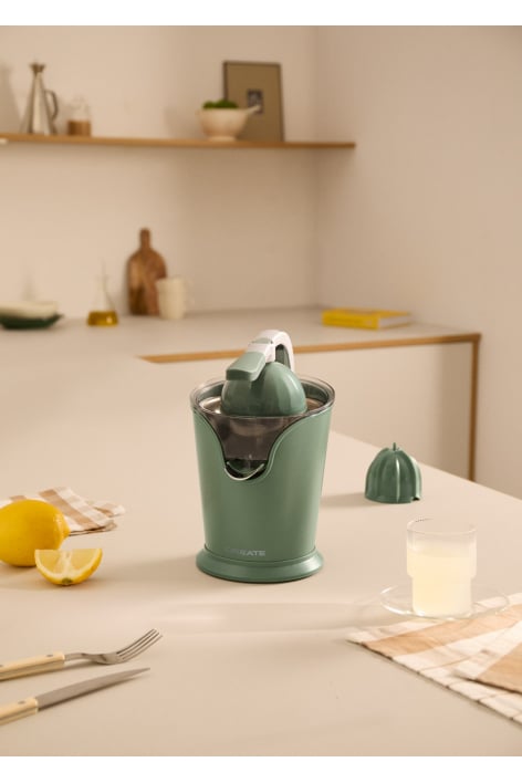 Exprimidor eléctrico de 100W para hacer zumos fácilmente y sin ensuciar. Cuenta con un brazo palanca para una mejor extracción, 2 conos para los distintos tipos de fruta, sistema anti goteo y un depósito de máximo 250ml de capacidad. Tiene protector de polvo y filtro de acero inoxidable. Además, sus piezas no eléctricas desmontables son aptas para el lavavajillas.
