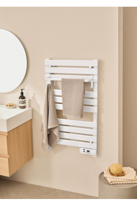 Toallero eléctrico de diseño moderno y de bajo consumo. Mantiene tus toallas secas y calientes además de irradiar calor en la estancia y evitar la humedad. Puedes elegir si colgarlo en la pared o añadirle patas para tenerlo en el suelo.