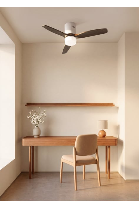 Ventilador de techo silencioso con motor DC 40W, función verano/invierno y 6 velocidades. Tiene temporizador programable hasta 4h. Puedes elegir entre la opción con luz LED con 3 temperaturas o la opción sin luz. También puedes escoger el modelo con WiFi para controlarlo desde tu móvil con la app Create o, por el contrario, elegir la combinación con controlador de pared.