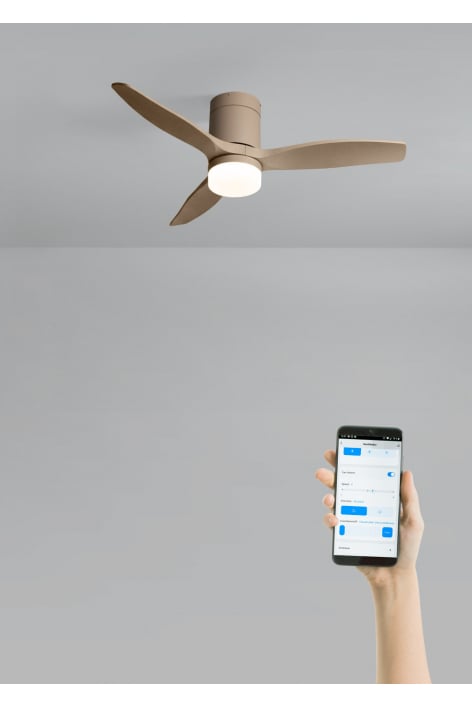 Ventilador de techo silencioso con motor DC 40W, función verano/invierno y 6 velocidades. Tiene temporizador programable hasta 4h. Puedes elegir entre la opción con luz LED con 3 temperaturas o la opción sin luz. También puedes escoger el modelo con WiFi para controlarlo desde tu móvil con la app Create.
