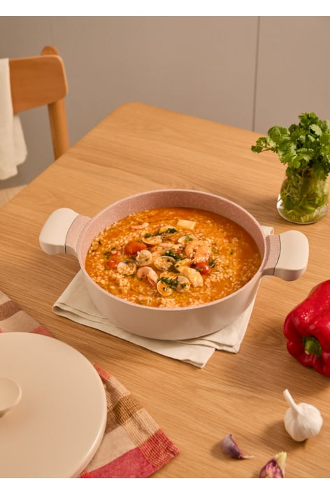 Cocotte en fonte d’aluminium avec revêtement anti-adhésif, disponible en deux tailles. Compatible avec tous types de cuisinières : induction, gaz, vitrocéramique, électrique et halogène. Sans PFOA.
