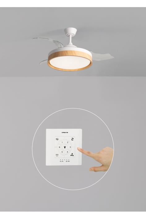 Ventilateur de plafond silencieux avec moteur DC Brushless de 40 W, garantissant une durée de vie plus longue. Il intègre une fonction été/hiver et 6 vitesses. Ses pales sont rétractables et il dispose d’une lumière LED intégrée avec 3 températures de couleur et une minuterie programmable jusqu’à 4 heures. Vous pouvez également choisir l’option WiFi pour le contrôler depuis votre téléphone portable via l’application Create.