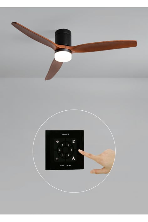 Ventilateur de plafond silencieux, équipé d’un moteur DC 40 W, fonction été-hiver et 6 vitesses. Minuteur programmable jusqu’à 4 h. Vous avez le choix entre l’option avec éclairage LED de 3 températures de couleur ou l’option sans éclairage. Vous pouvez également choisir le modèle avec Wi-Fi pour le piloter depuis votre portable avec l’application Create.