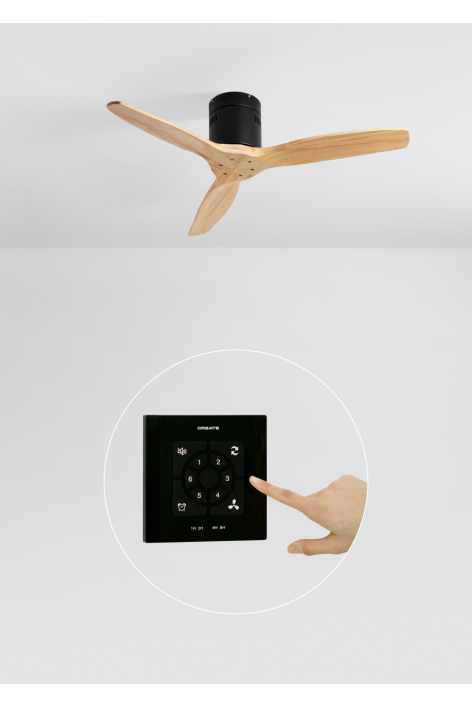 Ventilateur de plafond silencieux, équipé d’un moteur DC 40 W, fonction été-hiver et 6 vitesses. Minuteur programmable jusqu’à 4 h. Vous avez le choix entre l’option avec éclairage LED de 3 températures de couleur ou l’option sans éclairage. Vous pouvez également choisir le modèle avec Wi-Fi pour le piloter depuis votre portable avec l’application Create ou choisir la combinaison incluant la commande murale.