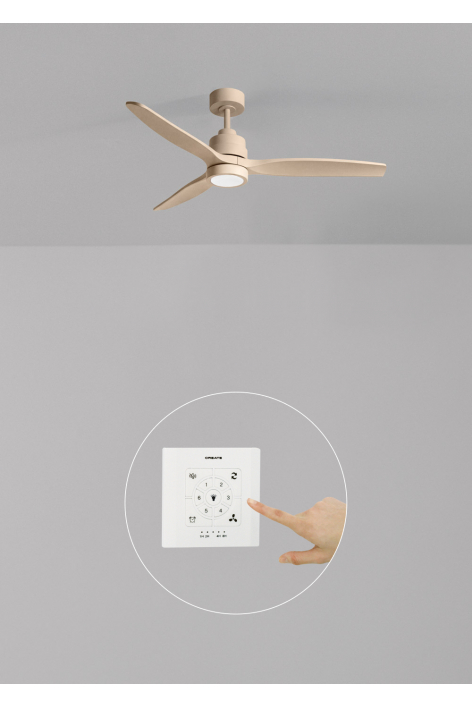 Ventilateur de plafond silencieux, équipé d’un moteur DC 40 W, fonction été-hiver et 6 vitesses. Minuteur programmable jusqu’à 4 h. Vous avez le choix entre l’option avec éclairage LED de 3 températures de couleur ou l’option sans éclairage. Vous pouvez également choisir le modèle avec Wi-Fi pour le piloter depuis votre portable avec l’application Create ou choisir la combinaison incluant la commande murale. De plus, deux tailles de tige sont incluses pour régler la hauteur du ventilateur.