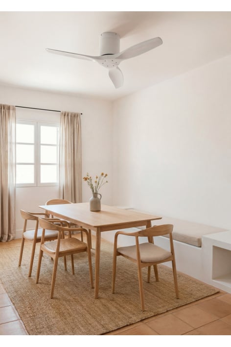 Ventilatore da soffitto silenzioso con motore DC 40 W, funzione estate/inverno e 6 velocità. Dispone di un timer programmabile in anticipo fino a 4 ore. Puoi scegliere tra l'opzione con luce LED a 3 temperature o l'opzione senza luce. Puoi anche scegliere il modello con wi-fi per controllarlo dal tuo telefono tramite l'app Create.