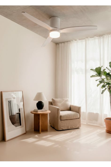 Ventilatore da soffitto silenzioso con motore DC 40 W, funzione estate/inverno e 6 velocità. Dispone di un timer programmabile in anticipo fino a 4 ore. Puoi scegliere tra l'opzione con luce LED a 3 temperature o l'opzione senza luce. Puoi anche scegliere il modello con wi-fi per controllarlo dal tuo telefono tramite l'app Create.