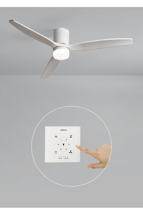 Ventilatore da soffitto silenzioso con motore DC 40 W, funzione estate/inverno e 6 velocità. Dispone di un timer programmabile in anticipo fino a 4 ore. Puoi scegliere tra l'opzione con luce LED a 3 temperature o l'opzione senza luce. Puoi anche scegliere il modello con wi-fi per controllarlo dal tuo telefono tramite l'app Create.