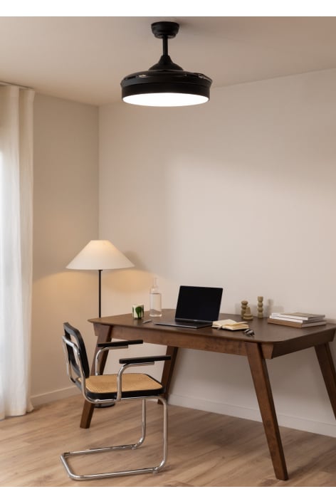 Ventilatore da soffitto silenzioso con motore DC 40 W, funzione estate/inverno e 6 velocità. Le sue pale sono a scomparsa. Possiede una luce LED incorporata con 3 temperature e dispone di un timer programmabile in anticipo fino a 4 ore. Puoi scegliere l’opzione con wi-fi per controllarlo dal tuo telefono tramite l'app Create.