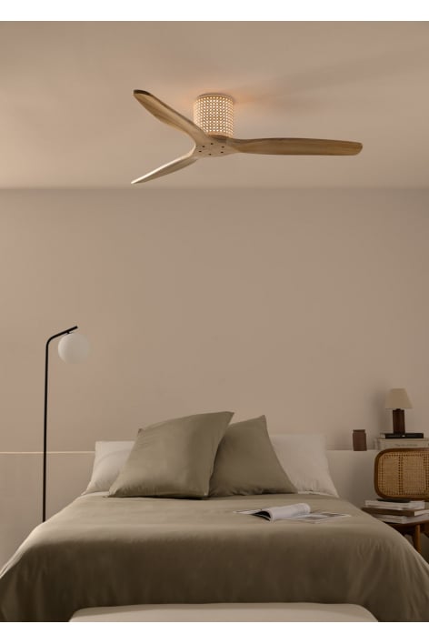 Zijn motor met rotanafwerking heeft een warm 15W LED-licht dat je onafhankelijk van het hoofdlicht of de werking van de ventilator kunt in- of uitschakelen.