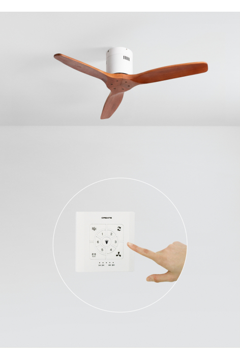 Stille plafondventilator met DC 40W-motor, omkeerfunctie zomer-winter en 6 snelheden. Met de timer kun je maximaal 4 uur instellen. Je kunt kiezen tussen de optie met LED-lamp met 3 kleurtemperaturen en de optie zonder lamp. Je kunt ook het model met wifi kiezen, dan kun je de ventilator bedienen met je mobiele telefoon via de Create-app. Of, heel anders, kiezen voor de combinatie met wandbediening.