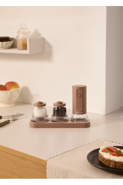 Zawiera dwa łatwe do napełnienia pojemniki oraz praktyczną bazę do przechowywania zarówno młynka, jak i pojemników. Zawsze schludnie i gotowe do użycia – nawet jako element dekoracyjny w kuchni.