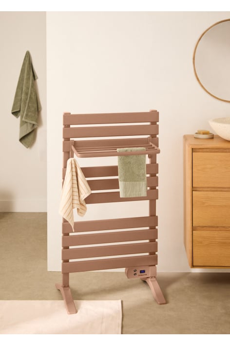 Elektryczny wieszak na ręczniki o nowoczesnej budowie i niskim zużyciu energii. Utrzymuje ręczniki suche i ciepłe, a także emituje ciepło w pomieszczeniu i zapobiega gromadzeniu się wilgoci. Możesz zdecydować, czy powiesić go na ścianie, czy dodać nóżki, aby postawić go na podłodze.