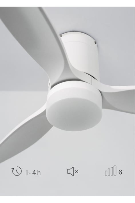 Cichy wentylator sufitowy z silnikiem DC 40 W, funkcją letnią/zimową i 6 prędkościami. Posiada programowalny timer do 4 godzin. Można wybrać opcję z oświetleniem LED z 3 temperaturami lub opcję bez oświetlenia. Możesz także wybrać model z WiFi, aby sterować nim z telefonu komórkowego za pomocą aplikacji Create lub, z drugiej strony, wybrać kombinację z kontrolerem ściennym.