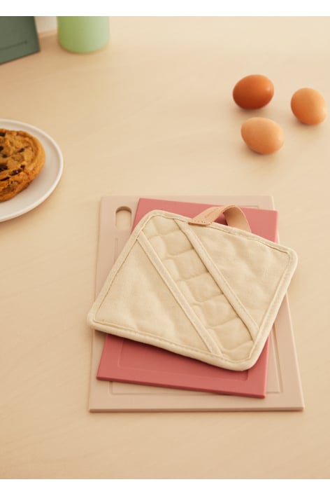 Luvas de forno. Existem dois tipos: em forma de luva e em forma quadrada. Ambas as luvas são fabricadas em algodão com pormenores em pele e são resistentes a temperaturas até aos 40 °C. Ambas pertencem à coleção Kitchenware Studio.