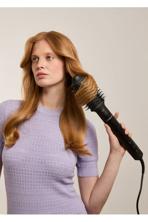 Escova modeladora com motor DC Brushless de 1400W. Moldeia facilmente o teu cabelo graças à tecnologia Coanda e ao revestimento cerâmico, que ajuda a cuidar do cabelo enquanto o penteias. Inclui 8 cabeças intercambiáveis (difusor grande, escova modeladora, escova volumizadora grande, concentrador de secagem, modelador esquerdo, modelador direito, cabeça Frizz-Free e escova larga), e 2 velocidades. Podes escolher entre 3 níveis de temperatura e função de ar frio. Inclui estojo de arrumação e base rígida para guardar tanto a escova como os acessórios. Inclui também uma luva resistente ao calor.