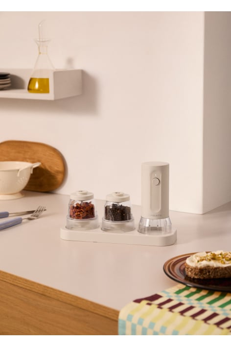 Inclui dois recipientes fáceis de recarregar e uma base prática para guardar tanto o moinho como os recipientes. Assim, estará sempre arrumado e pronto a usar – até mesmo como elemento decorativo na cozinha.