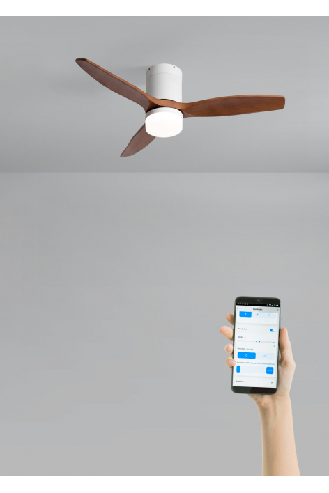 Ventoinha de teto silenciosa com motor DC 40 W, função verão/inverno e 6 velocidades. Tem um temporizador programável até 4h. Pode escolher entre a opção com luz LED com 3 temperaturas ou a opção sem luz. Também pode escolher o modelo com Wi-Fi para a controlar a partir do telemóvel com a aplicação Create.