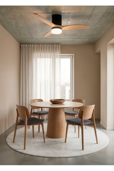 Ventoinha de teto silenciosa com motor DC 40 W, função verão/inverno e 6 velocidades. Tem um temporizador programável até 4h. Pode escolher entre a opção com luz LED com 3 temperaturas ou a opção sem luz. Também pode escolher o modelo com Wi-Fi para a controlar a partir do telemóvel com a aplicação Create.