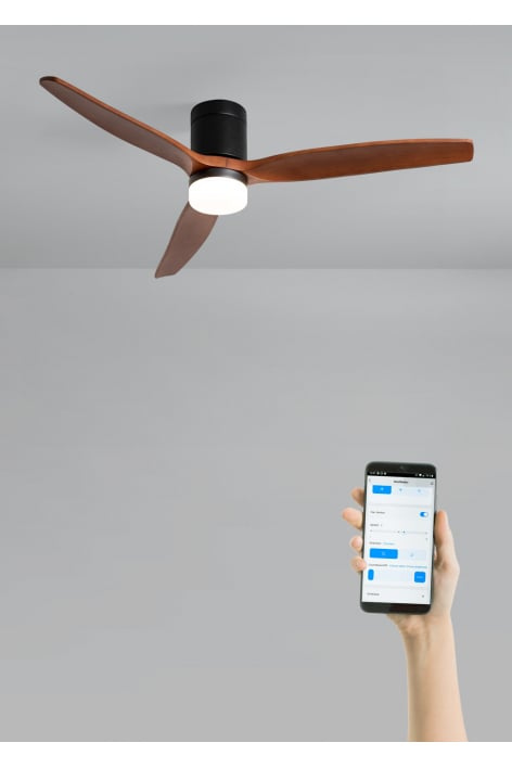 Ventoinha de teto silenciosa com motor DC 40 W, função verão/inverno e 6 velocidades. Tem um temporizador programável até 4h. Pode escolher entre a opção com luz LED com 3 temperaturas ou a opção sem luz. Também pode escolher o modelo com Wi-Fi para a controlar a partir do telemóvel com a aplicação Create.