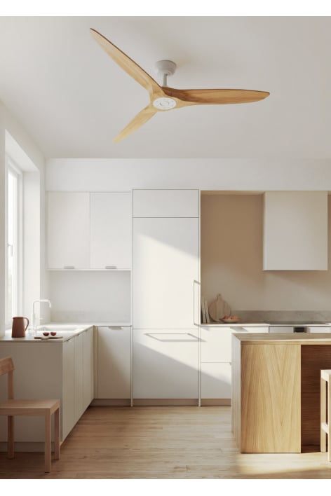 Ventilador de teto silencioso com motor DC de 40W, função verão/inverno e 6 velocidades. Disponível com luz LED (3 temperaturas) ou sem luz. Temporizador programável até 4 horas e controle remoto. Ideal para espaços de até 30m². As pás são feitas de madeira 100% natural.