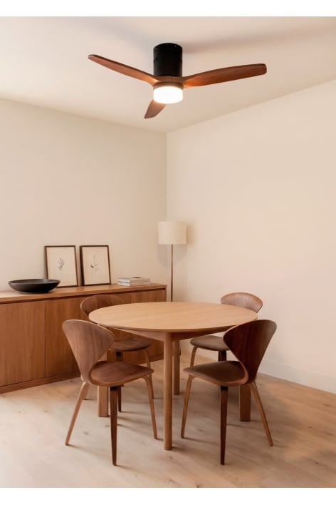 Ventoinha de teto silenciosa com motor DC 40 W, função verão/inverno e 6 velocidades. Tem um temporizador programável até 4h. Pode escolher entre a opção com luz LED com 3 temperaturas ou a opção sem luz. Também pode escolher o modelo com Wi-Fi para a controlar a partir do telemóvel com a aplicação Create ou, pelo contrário, escolher a combinação com um controlador de parede.