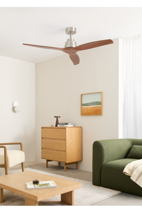 Ventoinha de teto silenciosa com motor DC 40 W, função verão/inverno e 6 velocidades. Tem um temporizador programável até 4h. Pode escolher entre a opção com luz LED com 3 temperaturas ou a opção sem luz. Também pode escolher o modelo com Wi-Fi para a controlar a partir do telemóvel com a aplicação Create ou, pelo contrário, escolher a combinação com um controlador de parede. Além disso, inclui dois tamanhos de haste para regular a altura do ventilador.