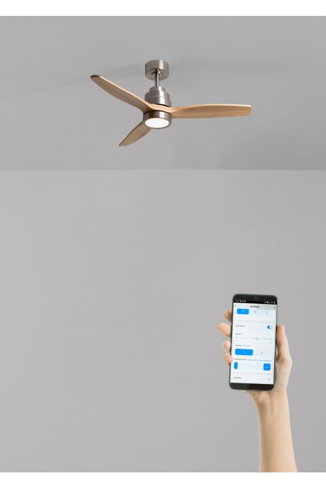 Ventoinha de teto silenciosa com motor DC 40 W, função verão/inverno e 6 velocidades. Tem um temporizador programável até 4h. Pode escolher entre a opção com luz LED com 3 temperaturas ou a opção sem luz. Também pode escolher o modelo com Wi-Fi para a controlar a partir do telemóvel com a aplicação Create ou, pelo contrário, escolher a combinação com um controlador de parede.