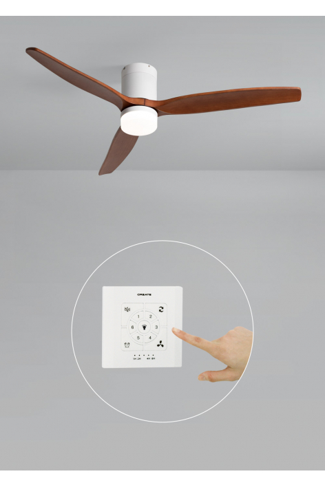 Silent ceiling fan with 40W DC motor, summer/winter function and 6 speeds. It has a programmable timer up to 4 hours. You can choose between the option with LED light with 3 temperatures or the option without light. You can also choose the Wi-Fi model to control it from your phone with the Create app.