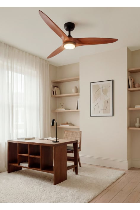 Silent ceiling fan with a 40W DC motor, summer/winter function, and 6 speeds. Available with LED light (3 color temperatures) or without light. Features a programmable timer up to 4 hours and a remote control. Ideal for rooms up to 30m². The blades are made of 100% natural wood.
