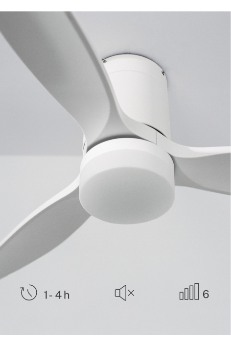 Silent ceiling fan with 40W DC motor, summer/winter function and 6 speeds. It has a programmable timer up to 4 hours. You can choose between the option with LED light with 3 temperatures or the option without light. You can also choose the Wi-Fi model to control it from your phone with the Create app, or choose the combination with a wall control.