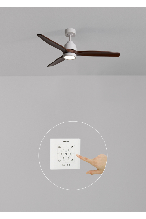 Silent ceiling fan with 40W DC motor, summer/winter function and 6 speeds. It has a programmable timer up to 4 hours. You can choose between the option with LED light with 3 temperatures or the option without light. You can also choose the Wi-Fi model to control it from your phone with the Create app, or choose the combination with a wall control. In addition, it includes two rod sizes to adjust the height of the fan.