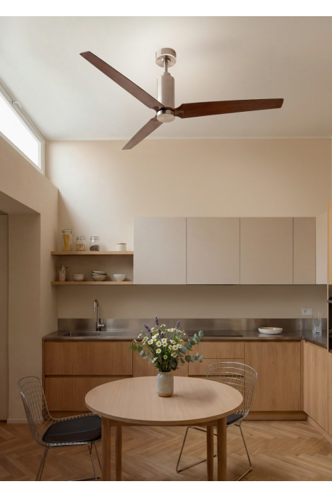 Silent ceiling fan with a 45 W brushless DC motor and 6 speeds. Its long adjustable downrod makes it perfect for rooms with high ceilings, allowing installation at the ideal height for optimal air circulation. It also features an upper ambient light that creates a warm and welcoming atmosphere. Includes a programmable timer of up to 4 hours and winter/summer function for year-round comfort.