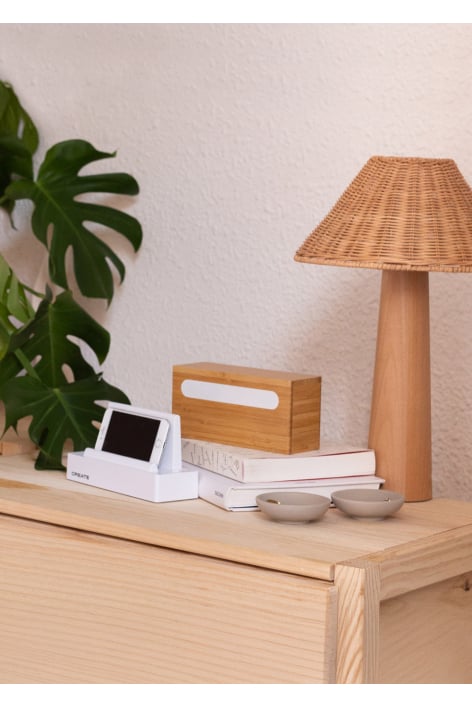Its lid is made from bamboo, a sustainable and very resistant material. Also, thanks to its 3-point cable (iPhone, Micro USB and Type C) you can recharge most mobile devices. It has a mesh so you can listen to alarms and notifications without any problems.