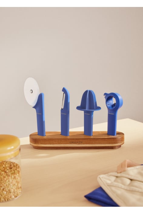 Pack consisting of 4 kitchen utensils: multifunction opener, manual lemon squeezer, straight blade fruit and vegetable peeler, and pizza wheel cutter. It also includes a wooden stand to hold the pieces. With this kitchen pack, you can prepare your recipes quickly and easily, achieving better results.
