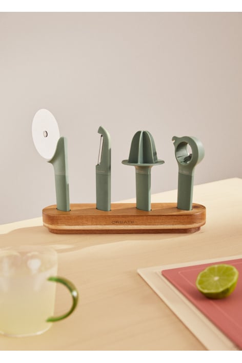Pack consisting of 4 kitchen utensils: multifunction opener, manual lemon squeezer, straight blade fruit and vegetable peeler, and pizza wheel cutter. It also includes a wooden stand to hold the pieces. With this kitchen pack, you can prepare your recipes quickly and easily, achieving better results.